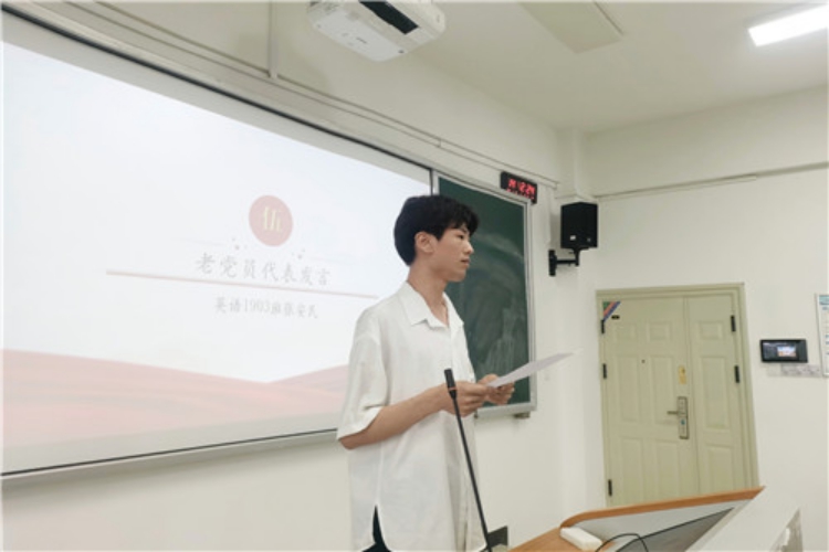 英语1903班张安民作为老党员代表发言。他首先表达了对新同志们的祝贺及对党员前辈们的感谢,随后代表全体党员向在场同志提出如下要求:一是坚定理想信念,时刻牢记使命;二是自觉接受党组织的教育、管理和监督;三是加强学习,努力提升政治素养和业务能力。
