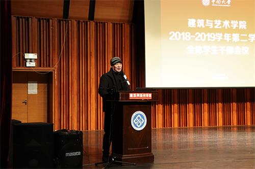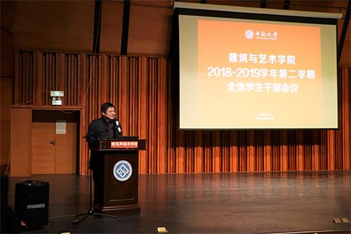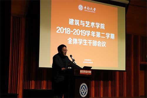 3月1日晚上7时30分,我院于艺术楼音乐厅举行了“建筑与艺术学院2018-2019学年第二学期全体学生干部会议”。我院党委书记喻跃龙、院长石磊、全体院领导、全体学办老师以及学院团委、学生会、研究生会、党支部、各年级主要学生干部出席本次会议,会议由院党委张金学副书记主持。