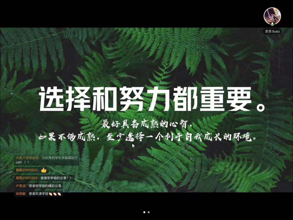 在求职时,同学们周围总是面临着许多不同的声音。刘苏学姐表示,选择和努力都重要,我们需要具备成熟的心智来判断自己想要做什么以及适合做什么,再与外部环境需求、企业自身情况相契合,取三者交集作为自己的求职目标。她建议同学们可以提前做一些实习来增进对不同公司及行业的了解。