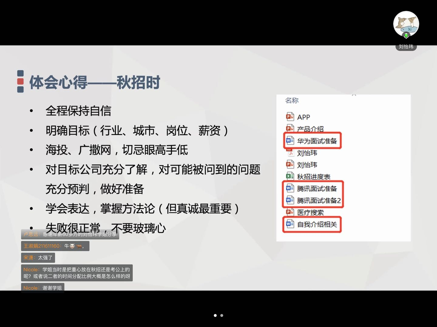 最后一位分享嘉宾是就职于腾讯的2022届硕士毕业生刘怡玮学姐。学姐介绍了自己的秋招成果、过往经历,分享了自己求职过程中的体会心得。