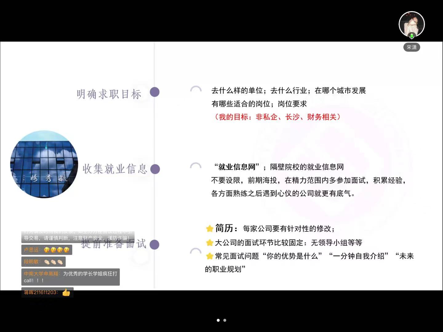 宋潇学姐指出,在求职的过程中,首先要明确就职目标。其次,要主动且广泛地收集就业信息,不要给自己设限,从一次次面试中积累经验、收获底气。再其次,要有针对性地提前准备面试,做好简历并准备常见的面试问题。