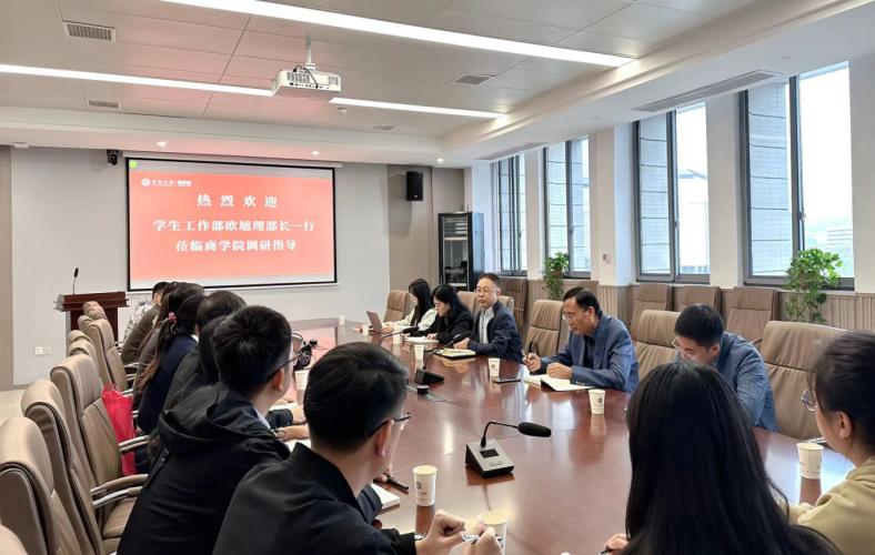 调研会上,欧旭理部长一行充分听取了我院大学生思想政治教育管理工作的基本情况、学生工作干部队伍建设基本情况以及风险排查专项工作的汇报。欧部长对商学院以往做出的特色亮点和取得的工作业绩表示了肯定,他指出,学生思想政治教育工作涵盖面广,关系到学校人才培养目标的实现,并且与学科建设紧密相连。欧部长寄语学院全体辅导员,在学院党委的领导下,不忘初心,与时俱进,当好学生的良师益友,争做辅导员队伍里的行家里手。