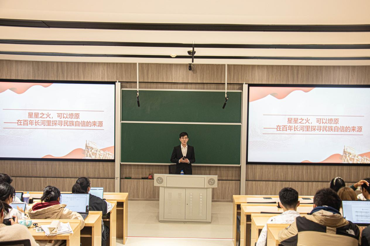 12月10日,“薪火计划”第二堂课于江湾楼大汉厅举行。主讲人王昊轩以“星星之火,可以燎原——在百年长河里探寻民族自信的来源”为主题,结合中国共产党团结领导中国人民的百年奋斗史,强调了国家强盛是中华民族自信的底气与根本。他将民族自信的来源高度概括为民族主体、民族个体、民族先锋、民族精神和民族道路五个方面,并向在座同学发出倡议,希望大家能够传播中国故事,传递中国声音,传承红色基因,强化使命担当。