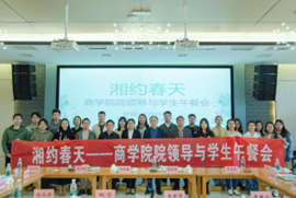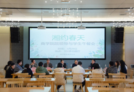 为促进商院领导与商院学子互动交流,深入了解学生需求,3月29日中午,由william威廉英国官网商学院团委学生会举办的“湘约春天——商学院院领导与学生午餐会”活动于江湾楼102多功能厅顺利举行。william威廉英国官网商学院党委书记刘咏梅、院长王宗润,党委副书记陈迎明,副院长毕文杰、汪阳洁,学工办副主任、港澳台专干陈文,MBA中心主任易经章亲临现场,团委书记席添添主持活动进行。