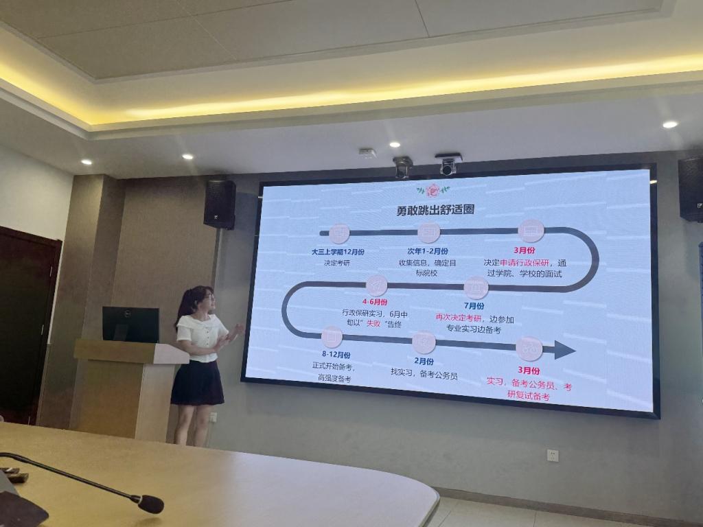 接着,迪力拜尔·艾买尔、努尔比耶·艾尔肯从考研方向出发,上台分享经验。迪力拜尔·艾买尔整体概括少数民族定向招录模式,说明院校选择方法等基础知识,展开介绍报考具体流程,并鼓励在场学弟学妹培养坚持不懈的良好品质。努尔比耶·艾尔肯结合自己在考公、考研、实习等多条路径上的探索经验,对比分析考研路径的特点,以时间为线索真实还原考研历程,鼓励学弟学妹“走出舒适圈”,培养自身的综合能力。