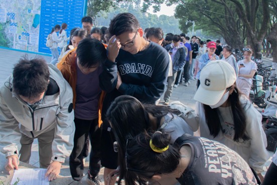 集合完毕后,全体同学在海报墙前拍照留念。在整齐的口号——“趁青春,去登山”中,本次活动正式开始。同学们有序进行签到,并领取物资,三三两两地结队登山。