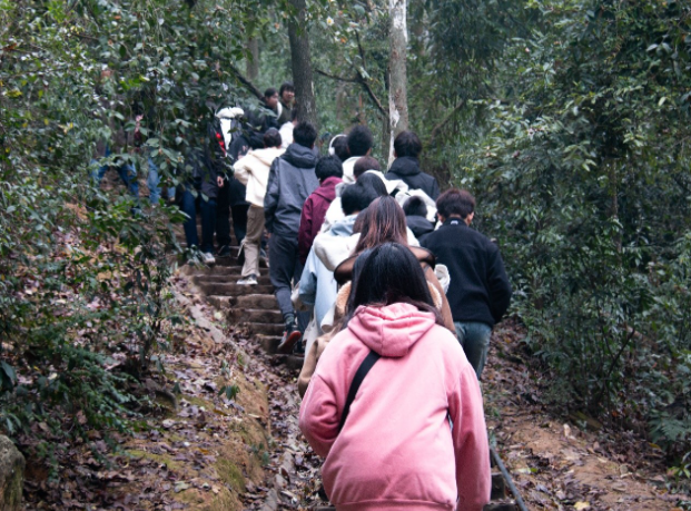 从校本部入口踏进岳麓后山,同学们先经过一段绵延的石梯,继而迈上宽阔的山间大道。将近一个小时的登山行程中,坡陡路滑处,同学们伸手互助;体力不支时,他们彼此鼓励分担。靠着始终如一的登山热情与相互鼓励的情谊,同学们奋力前进,最终成功登顶,将岳麓胜景尽收眼底。