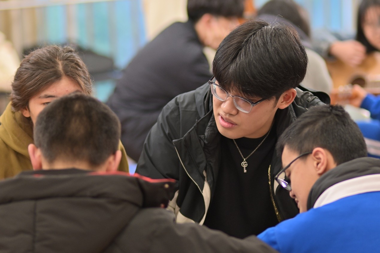 活动伊始,主持人向社团志愿者与活动参与者介绍线下授课的整体流程,并对孩子们表示亲切的问候与鼓励。教学正式开场,歌唱声与乐器的和音渐于人群涌起升腾,似晨钟破晓、如星火燎原:在志愿者的鼓励与指导下,孩子们逐步放下了紧张害羞的情绪,气氛从安静到热烈、歌喉由呢喃到颂唱,他们弹奏着手中的吉他和尤克里里,拨动琴弦为孩子们轻声唱和,整个活动室漾起温暖的音乐,仿佛一束束从窗外跳进来的、毛茸茸的阳光。