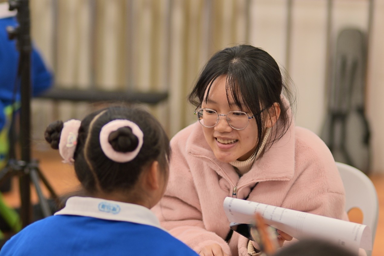 音传厚谊,“寻光计划”志愿者在传授基础乐理知识的同时,也高度重视与孩子们建立友善关系、与他们共同认识这个温暖的世界。活动开始一小时后,孩子们基本掌握了歌曲,大家齐声合唱,柔和的声浪在每个人的耳边振荡。天使般的童声将字里行间的“阳光”具象化,音符跃动的间隙,孩子们的笑声如清泉般在教室中流淌。当最后一个和弦缓缓收尾,志愿者们蹲下身与孩子们平视交流,指尖相触,传递彼此的温度。