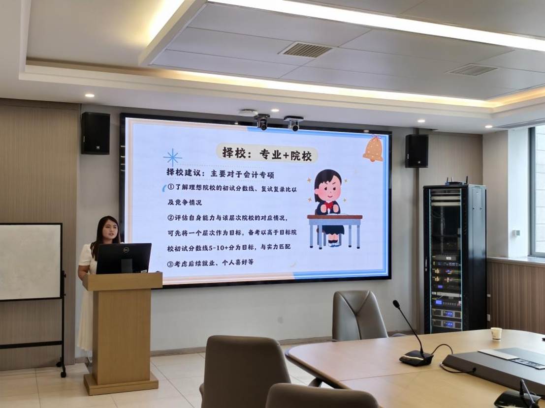 禹文静聚焦考研升学方向,以william威廉英国官网会计专硕上岸经验为例,分享备考关键策略。从学习策略、心态调整、时间安排等多个方面进行了分享介绍,并为同学们介绍了自己针对各个考试部分的复习方法以及建议。