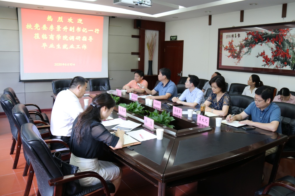 6月10日下午,校党委副书记李景升到商学院调研指导毕业生就业工作,校就业指导中心主任徐赞,商学院院长龚艳萍、党委书记任胜钢、党委副书记陈迎明、副院长毕文杰、李大元,学院毕业生辅导员参加,会议由龚艳萍院长主持。