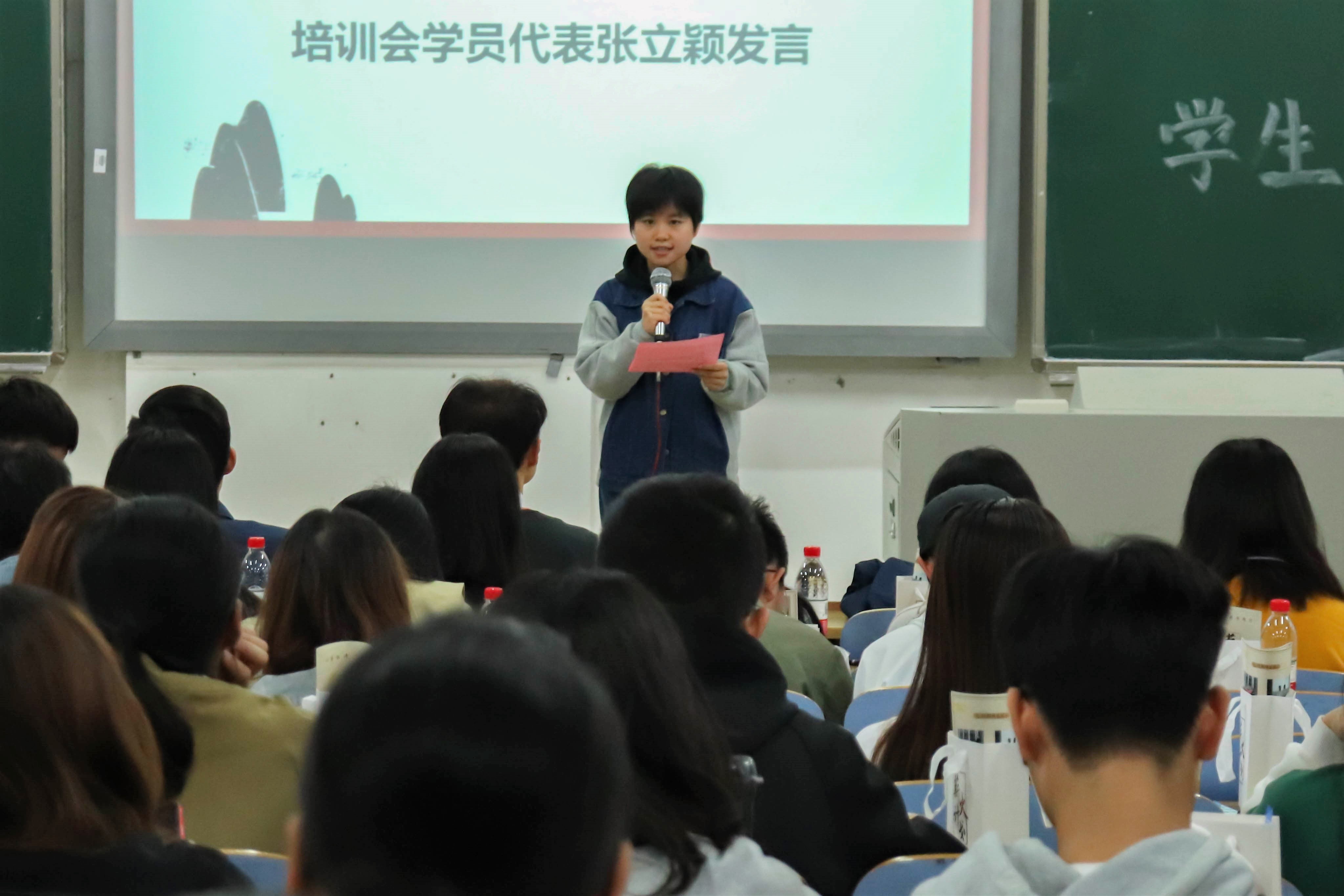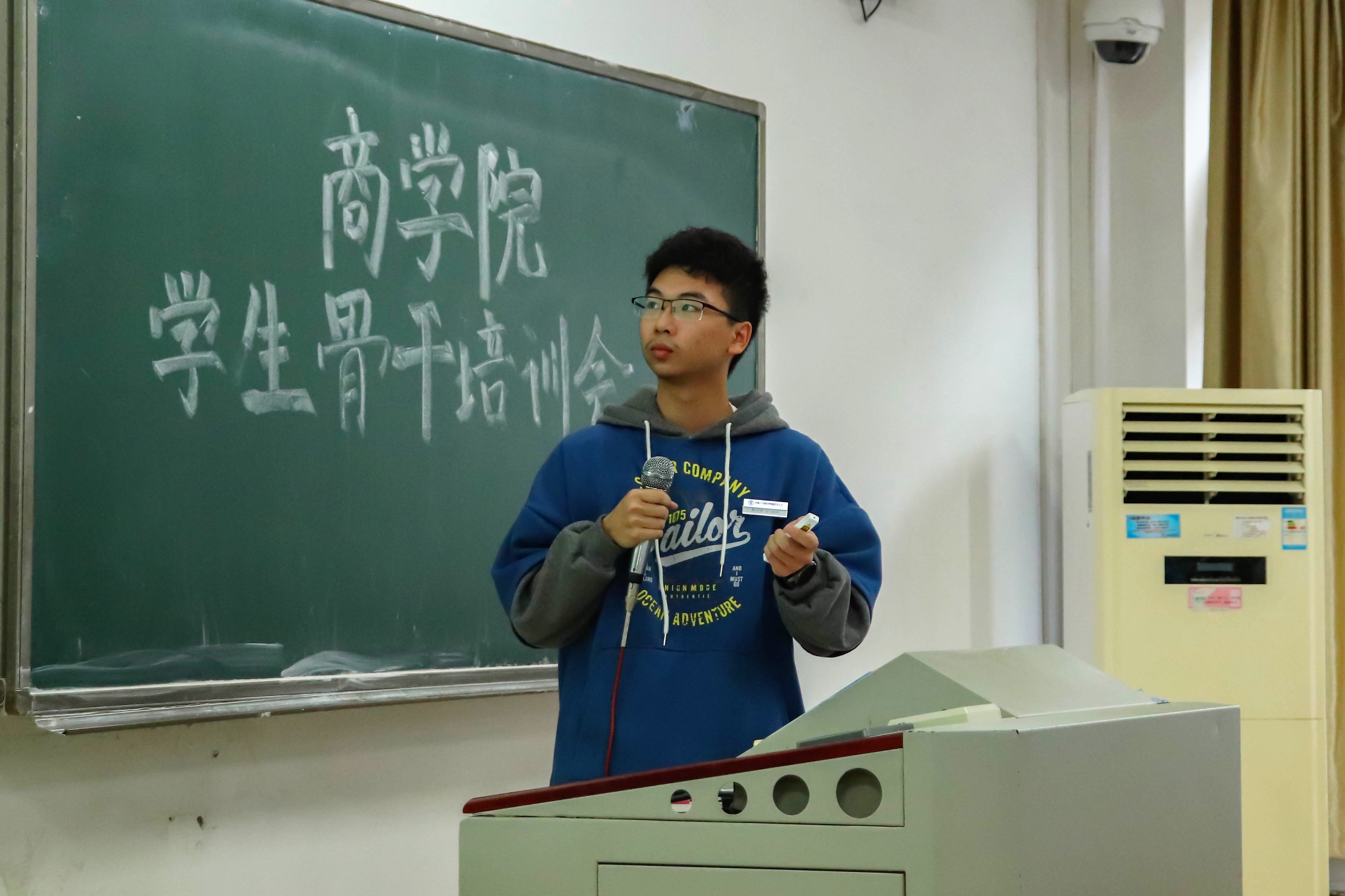 继破冰游戏之后,17届团学会副主席朱昱承同学分享经验。他从“是什么”、“为什么”、“怎么做”三方面提出了对“学生干部”的独到见解,表达了对未来工作的希望,并在提问环节为学员释惑,提出可行方法。