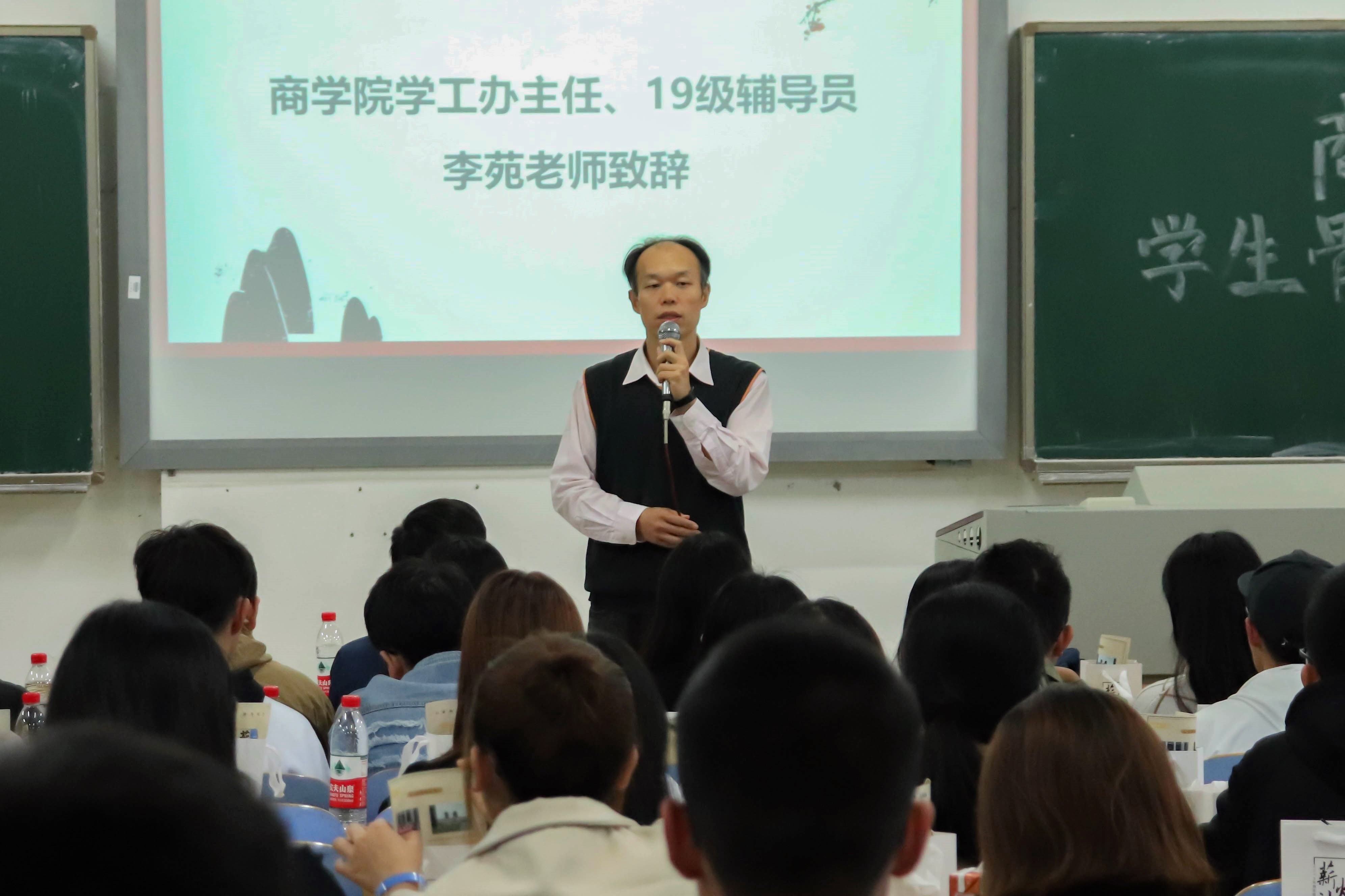 在欢快的音乐声中,开幕式拉开帷幕。开幕式伊始,李苑老师为本次活动致辞。他首先明确了薪火计划之于商学院学生工作的品牌地位。随后他以院训“天道酬勤”为基,解读了薪火相传的具体内容,突出“勤”的现实意义,要求学员用心领略对学院、对事业的自豪感,传承天道酬勤的院训,把优秀内化为习惯。他希望学员们发挥主观能动性,将主动性、延续性和创新性运用到学生工作实践之中,并表达了对本次活动及参与学员的美好祝愿。
