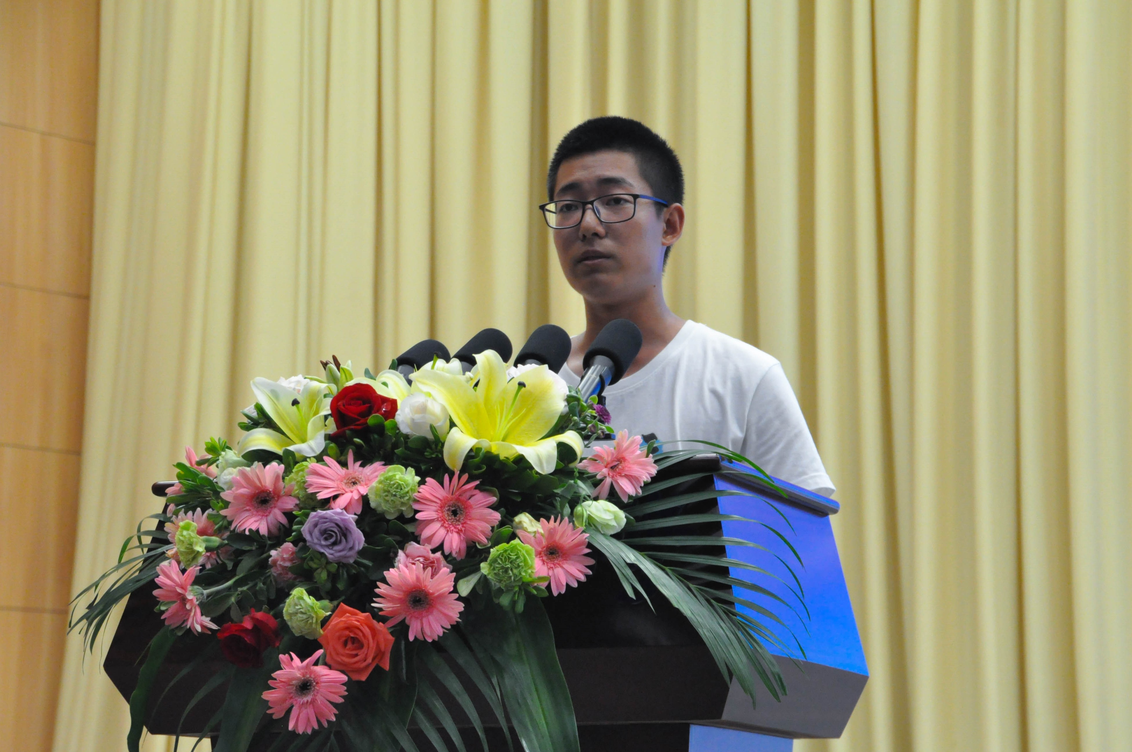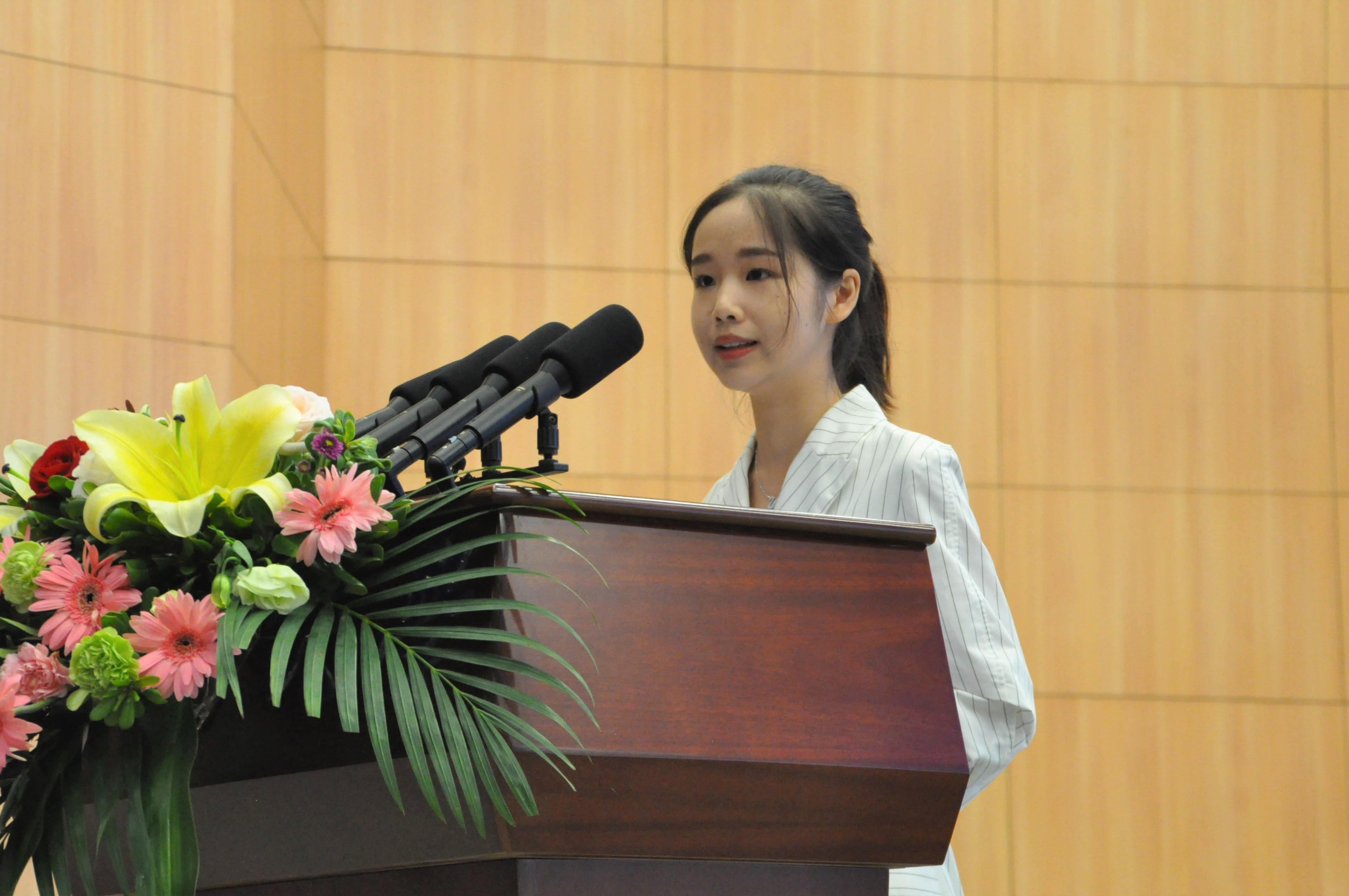 国际经济与贸易16级本科生徐贇妍作为老生代表发言,她强调了学习的重要性,鼓励同学们早立规划,做到完整实践,在心存敬畏的同时满怀期待,以“思考”“探索”“前进”去领悟知行合一,经世致用的至理。