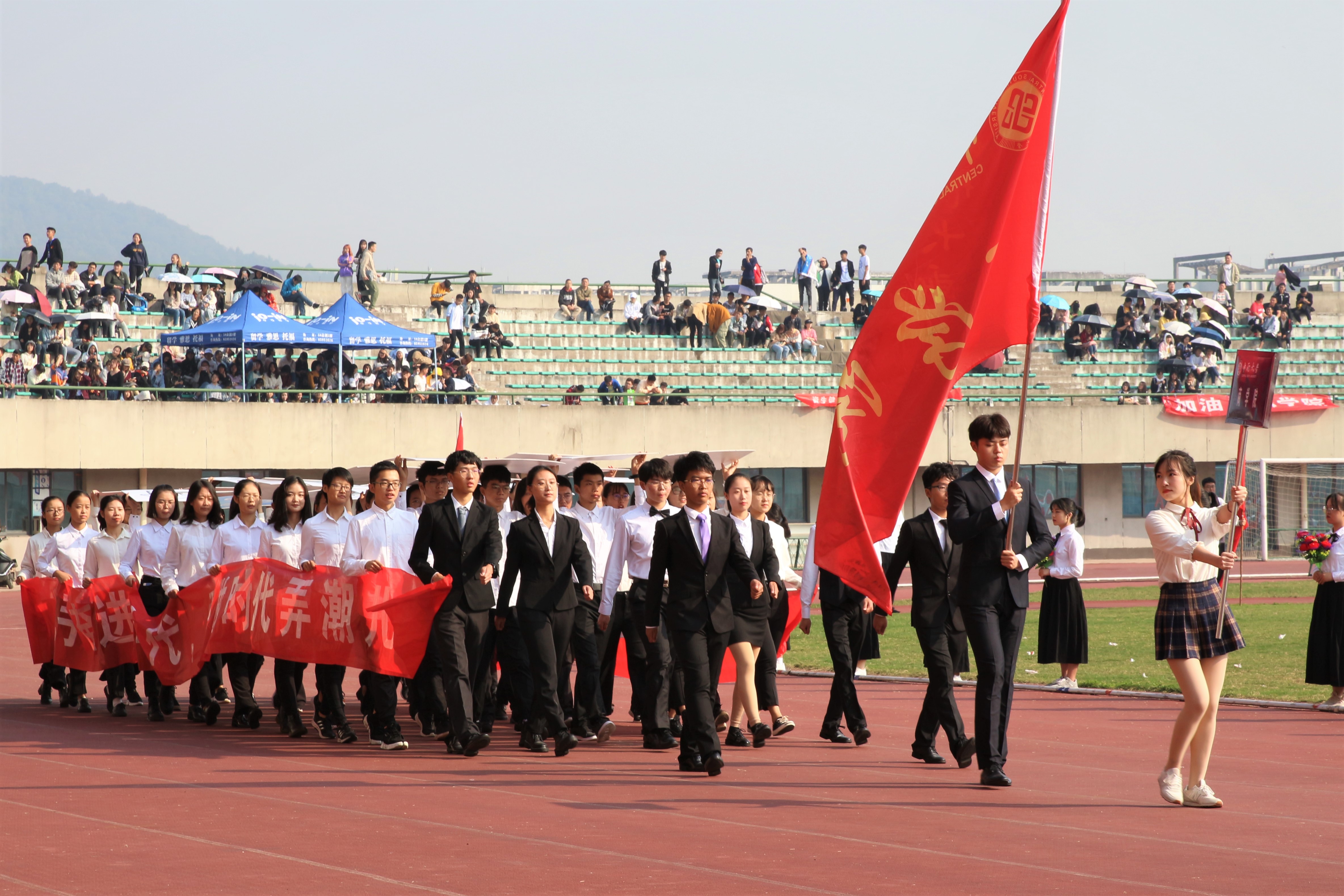 开幕式上,商学院精英方队雄姿英发,“携手奋进新时代,勇做时代弄潮儿”的口号昭示着商院学子与时代共进的风采。表演方阵大放异彩,太极拳方队勇夺第一,广播操、跳绳方队争得前三。