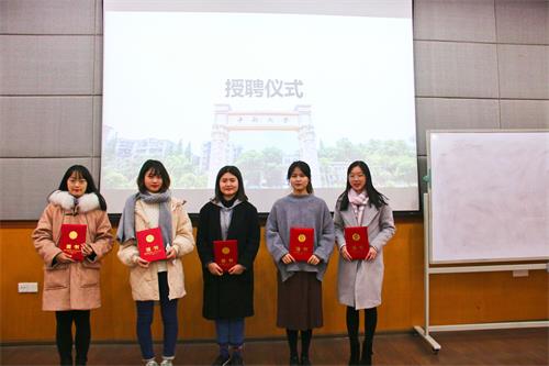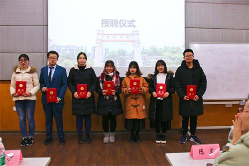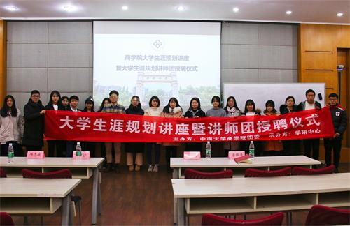 12月12日晚,商学院大学生涯规划讲座暨大学生涯规划讲师团授聘仪式在校本部管理楼409顺利举行。院团委书记陈文, 17级辅导员梁程浩,18级辅导员黄河沙、邓志诚及近百名学生参加此次活动。