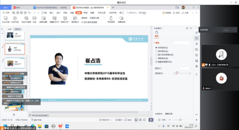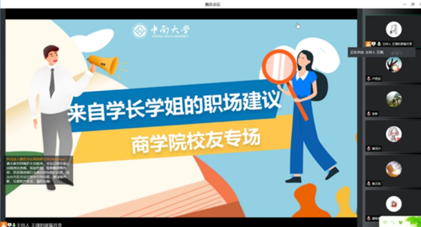 以梦为马,不负韶华;以商为灯,不负青春。为了让商院同学更加了解当前就业市场、提前规划职业生涯,4月27日晚,在学校就业指导中心的指导下,来自学长学姐的职场建议之商学院校友专场线上讲座顺利召开。讲座邀请到了李彬、崔占浩、龚电明三位来自不同行业的商院优秀学长学姐为大家分享求职经验,商学院各年级辅导员和学生参加本次讲座。据悉,为让更多尚在校园的学子与已“征战”职场的学长学姐交流经验,中南迄今已举办三届“来自学长学姐的职场建议”校友导师生涯辅导活动。