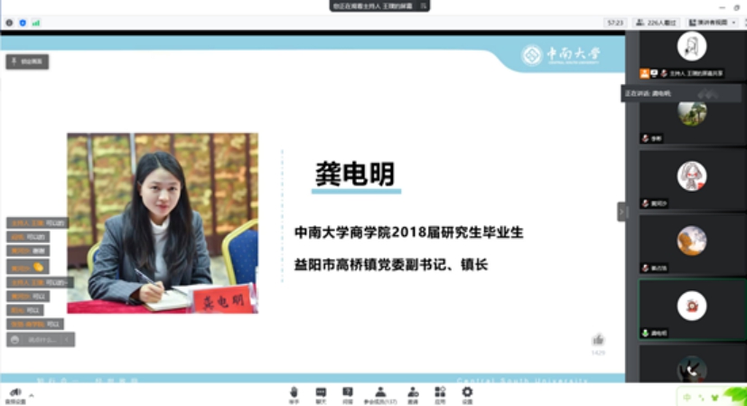 随后,商学院2018届硕士毕业生、益阳市高桥镇党委副书记、镇长龚电明学姐立足“踔厉奋发,让青春在党和人民需要的地方绽放”为同学们分享了她的选调生工作经历。她结合自己的基层工作实际为大家勾勒出基层工作蓝图,让大家更深入了解了什么是基层、基层需要什么人、基层工作内容有什么等问题,帮助有志于考取选调生的同学对基层工作有了更具体的认识。