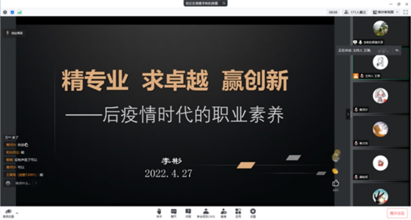 首先,商学院2010届硕士毕业生、现任某金融租赁公司事业部总经理李彬学长围绕“后疫情时代的职业素养”进行了交流。李彬以其丰富的工作经历为例,提出了当前就业市场企业人才需要具备的三个优秀素养。他强调,当前企业重视以结果为导向,以创新创造生存空间,以正道达成目标,因此他建议大家在大学生活中不断锤炼卓越自我,走出校园后坚守初心,找到适合自己的领域。