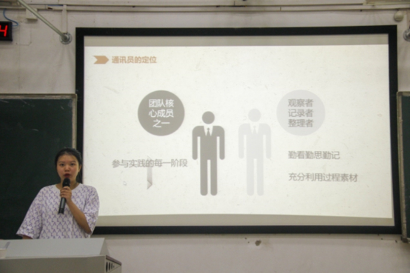 会议伊始,席添添老师上台致辞。她对同学们未来的社会实践工作提出了三点要求和期望。第一,要珍惜锻炼机会,勇敢地迈向社会,开拓视野,展现当代大学生的风采;第二,立足长远,在社会实践的过程中不断挖掘利用社会资源,丰富个人简历;第三,做好宣传推广工作,不但在校内的宣传平台进行推送,还可以将暑实的成果传递给媒体,吸引社会各界的关注。