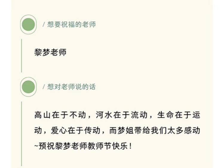 春蚕到死丝方尽,蜡炬成灰泪始干。老师犹如辛勤的园丁,以拳拳之心培育祖国的未来。本次祝福活动以第38个教师节为契机,为同学们提供了一个感谢教师,回报教师的平台,有利于畅通师生交流,增进师生感情,对我院有序开展教学工作,营造尊敬师长的良好氛围具有重要意义。希望我院学子能够不忘师恩,将尊师重道的优良传统内化于心,外化于行,以优异的学习成绩回报老师们的谆谆教诲。