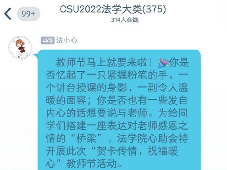为构建和谐师生关系,弘扬尊师重教的优良传统,9月10日,法学院心助会开展“贺卡传情,祝福暖心”教师节主题活动。我院学子踊跃参与其中,积极表达对教师的感恩之情。活动总体进展顺利,收效甚佳。
