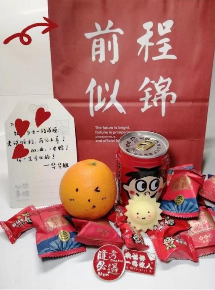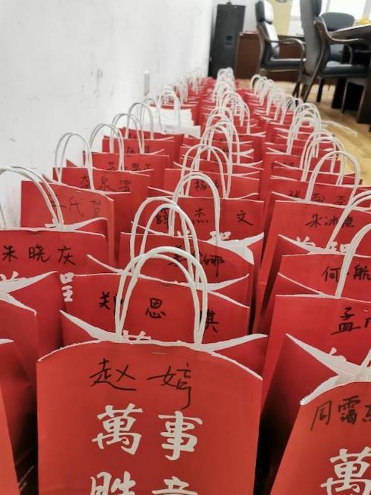 活动开始前,吴华老师与学生代表一同为考研学子们精心准备了暖心大礼包。礼包为印有“万事胜意”、“前程似锦”等字样的红色礼袋,礼袋内不仅有牛奶、糖果、寓意“心想事成”的橙子,还有明信片、考研励志徽章等精致礼物。