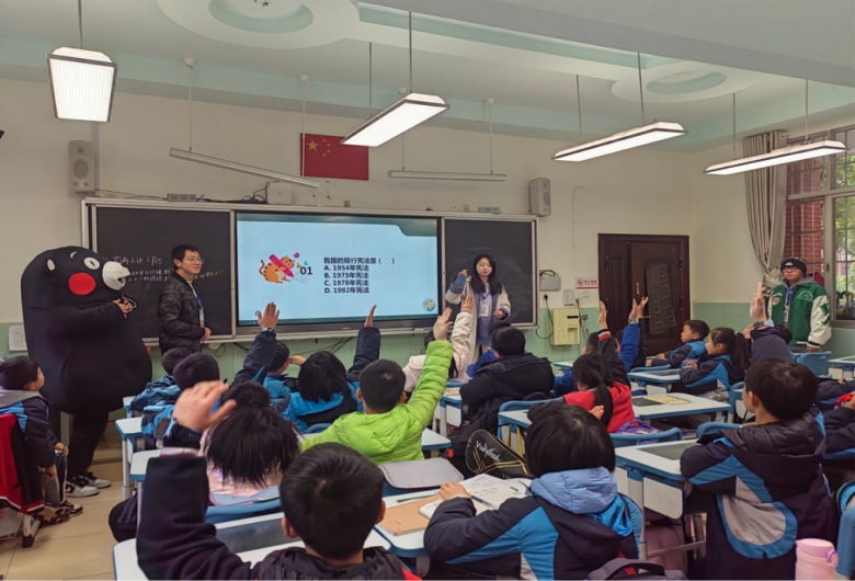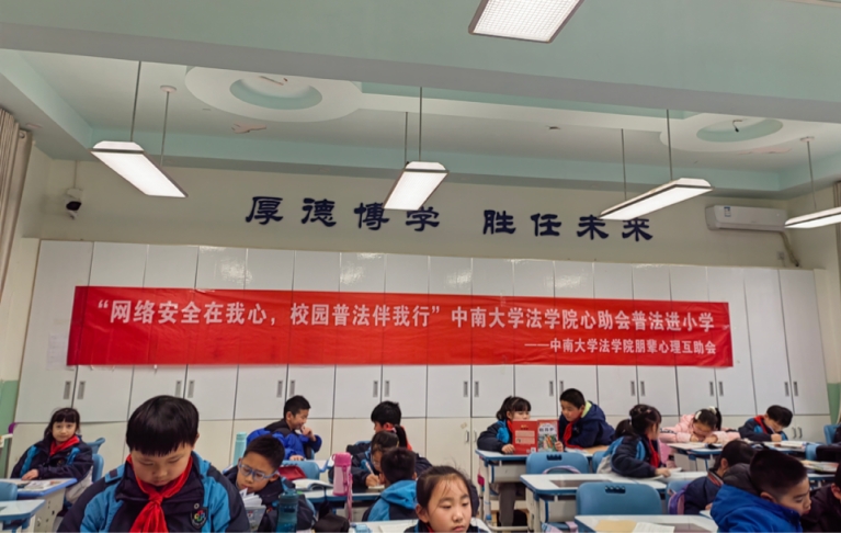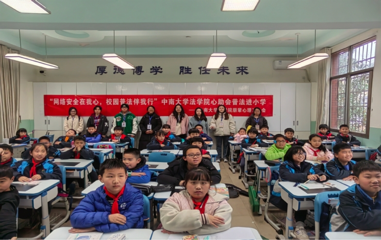 下课后,全班同学和宣讲成员们合影留念。此次普法进小学活动为同学们普及了宪法知识,帮助大家了解消费者权益,更好防范网络安全风险。同时,法学院心助会也将肩负起共同守护青少年心理健康的责任,为他们营造更和谐健康的心理成长环境。在一次次普法进小学活动中,相信法律意识将不断在小学生心中深植,法治精神将不断在青少年群体中发扬。