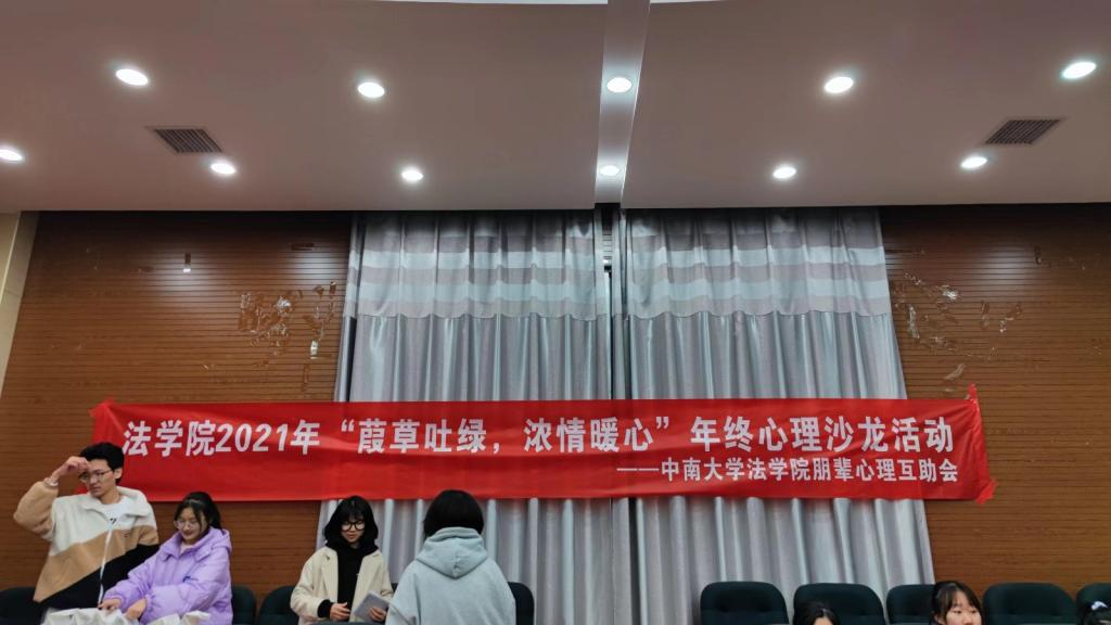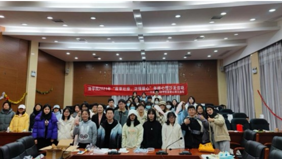 2021年12月19日晚七点,法学院朋辈心理互助会“葭草吐绿,浓情暖心”年终心理沙龙活动于文法楼123室顺利举行,心助会全体成员到场参加。此次活动旨在总结回顾本学期工作情况,同时缓解同学们期末备考的紧张压力,维系成员间的情感纽带,增强心助会内部的向心力与凝聚力。