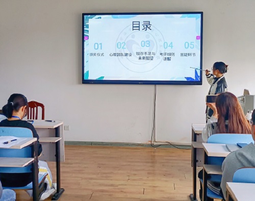 本次会议围绕工作培训、提问答疑、颁奖留念三个环节展开。会议伊始,研培部部长李雨霏总结了以往心理工作中存在的不足,并详细介绍了我院心委考评细则,为后续心理工作的高质量开展提供了大致参考方向。针对同学们在学习生活中可能面临的冲突矛盾,李雨霏部长强调,心理委员们应充分发挥润滑剂作用,努力调解冲突,化解矛盾,帮助同学们有效协调人际关系,拥抱美好生活。