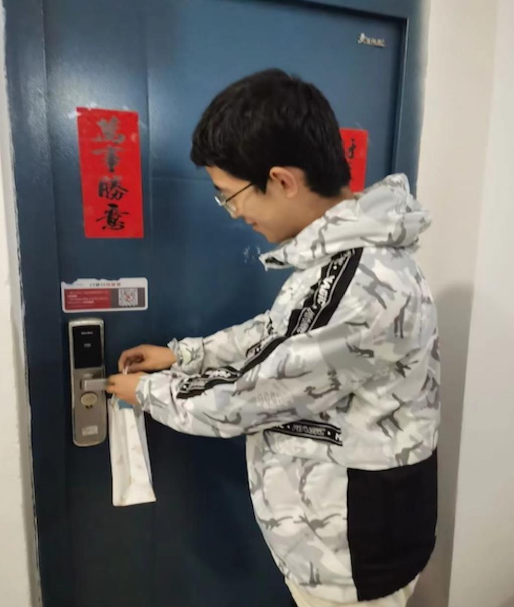 秉着不打扰和无接触的原则,送暖小队将防疫礼品袋悬挂于宿舍门把手上,同时将鲜花束用胶带固定在门上,在默默无声中,一份份温暖已然悄悄抵达。至此,法学院疫中送暖活动圆满结束。
