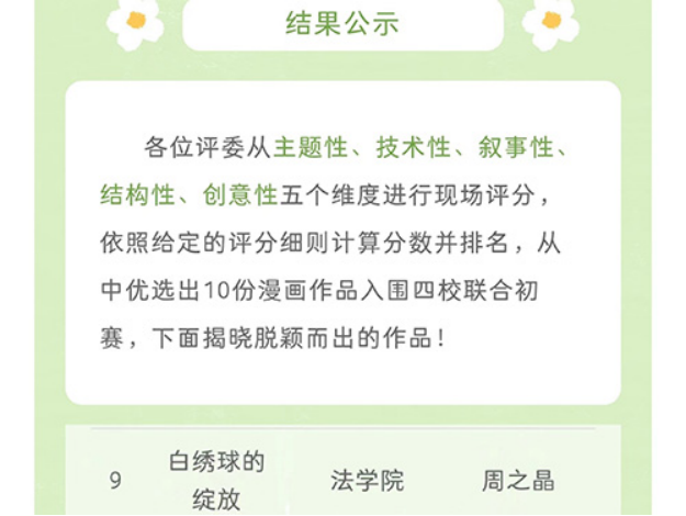 在漫画《白绣球的绽放》中,我院周之晶同学讲述了初入大学迷茫孤独、处处受挫的自我,在寻找自己、拥抱自己、热爱自己、完善自己的过程里不断成长、取得成功的故事。与此同时,作者借物喻人,将象征希望与光明的白绣球花融入漫画主旨,激励读者如白绣球花一般坚韧不拔、活出精彩。而在绘画方面,作者可谓独具匠心。在她的画笔之下,人物可爱生动,色调清新明亮,画面极具美感。整幅漫画实现了立意与审美的有机统一,在引发评委们强烈共鸣的同时,亦收获了较高的评价。最终,该漫画成功入围四校联合初赛。