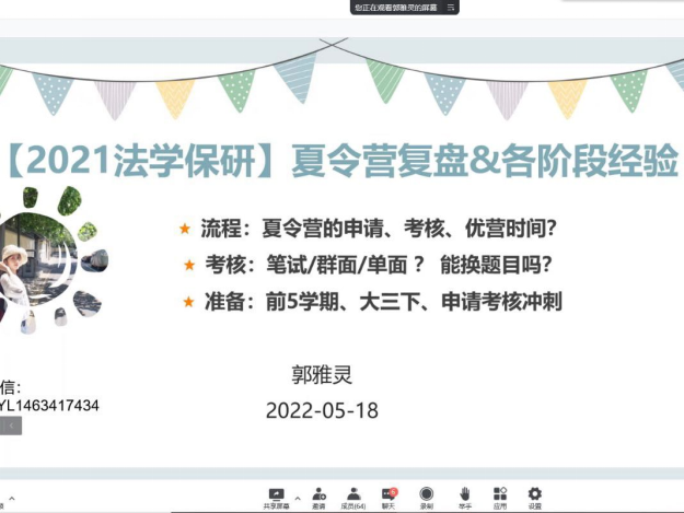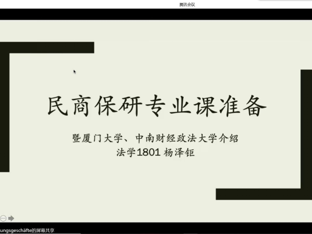 紧接着,杨泽矩学长为大家介绍民商法专业课准备思路和复习重点,并以部分院校的考察特点为例讲解复习技巧。经过他的讲解,同学们认识到尽早做好职业规划的必要性,也愈加坚定了自己的目标院校。随后,保研至华东政法大学的尹丝媛学姐就保研夏令营这一话题分享自己的心得与见解,讲述自己参营过程中遇到的困难,并提供调节心态的方法,希望同学们保持积极乐观良好心态。