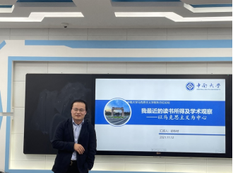 主讲人胡栋材老师以“我最近的读书所得及学术观察——以马克思主义为中心为大家分享了他最近的读书心得及所思所感。胡栋材老师的分享主要围绕关于读书与学术、读书所得、学术观察及基本规划四个方面展开。首先,他为同学们解答了关于为何读、读什么、怎么读三个问题,接着从其最近所读的《社会学大纲》、《马克思与孔夫子》以及《习近平总书记系列重要讲话读本》出发,分享了自己关于读书的一些看法。他指出:怀疑是学术的母亲,我们的理论工作者不能辜负这个伟大的时代,要担负起理论工作者的时代使命——讲清讲透理论逻辑与现实问题。