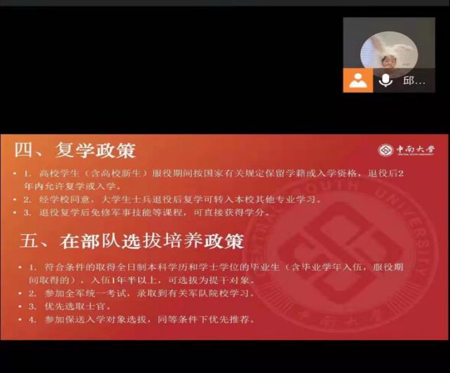 本次活动就大学毕业生相关创业就业重点政策进行讲解。此外,对于高校学生服役期间按国家有关规定保留学籍或入学资格,退役后两年内允许复学或入学的情况加以介绍。宣讲团队也对当下在部队选拔培养政策加一讲解。