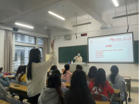 随后,班会进入“安全知识抢答赛”环节。同学们分成了不同小组,根据屏幕上出现的安全知识题目参与竞答,最终积分最高的小组可获得相应的奖励。同学们踊跃参与、积极答题,在寓教于乐中增进了同学们的国家安全知识。