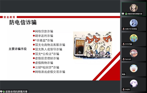 辅导员梁慧就防电信诈骗、交通安全、食品安全以及用电安全等四个方面对同学们提出警示以及要求。会议伊始,梁老师列举了常见的电信诈骗手段,并强调“国家反诈中心”APP的作用及重要性。随后基于我校校园占地面积较广、各校区之间间隔较远,电动车使用频率高,校园交通安全事故频发的客观实际,提醒同学们注意车速、遵守交规并且正确佩戴头盔。之后,梁老师又再次强调了当前全国高校常见的宿舍、教室用电安全以及食品安全问题,希望同学们规范使用电器、关注食品安全,安不忘危,杜渐防萌。