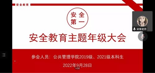 9月28日晚上9时,公共管理学院安全教育主题线上年级大会顺利进行,学院19级与21级辅导员梁慧为年级大会主讲人,公管院19级与21级全体本科生参与此次会议。