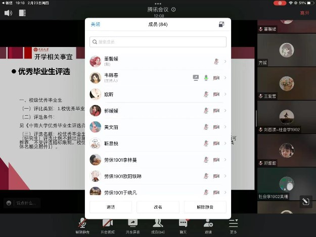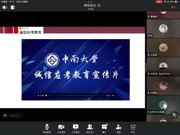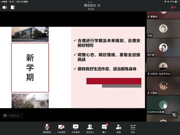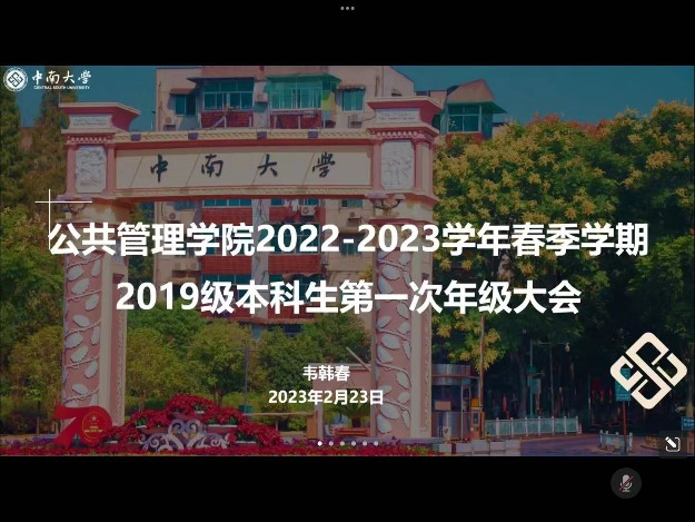 为扎实做好新学期各项工作,营造文明、诚信考试的良好氛围,切实加强新学期的安全教育工作,进一步了解同学们的思想动态和学习生活状态,公管院于2023年2月23日晚上19时线上召开2022-2023春季学期2019级本科生第一次年级大会,本次会议由学院兼职辅导员韦韩春主持,辅导员梁慧和19级全体本科生同学参与。