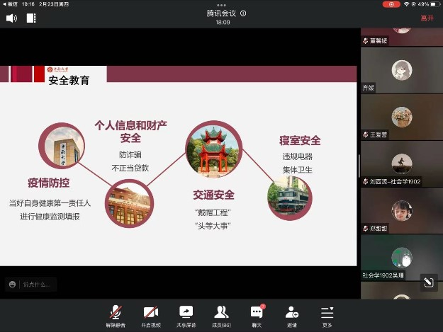 随后,韦老师就疫情防控、个人信息和财产安全、交通安全、寝室安全、实习安全五个方面依次开展安全教育。尤其是当前疫情防控工作不容松懈,她提醒同学们切勿放松警惕,当好自身健康的第一责任人。同时,现今校园诈骗方式层出不穷,同学们应谨防“付费实习”、“传销陷阱”、“只试用不录取”等新型骗局,提高甄别和防范非法网贷诈骗的能力。由于新学期校外实习同学人数较多,韦老师依据学校规定,详细讲解了校外实习的申请手续。最后,韦老师以“升学”、“就业”、“实习”、“毕业”四个关键词向同学们提出了新学期的展望,并给予各位同学衷心的祝愿。