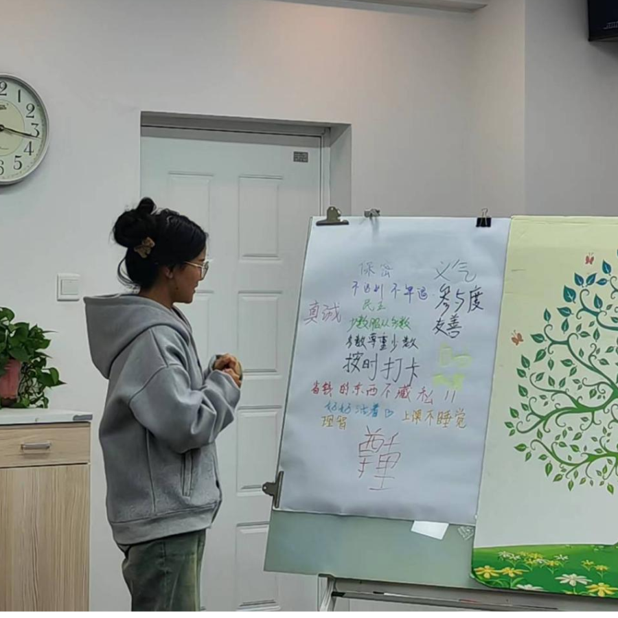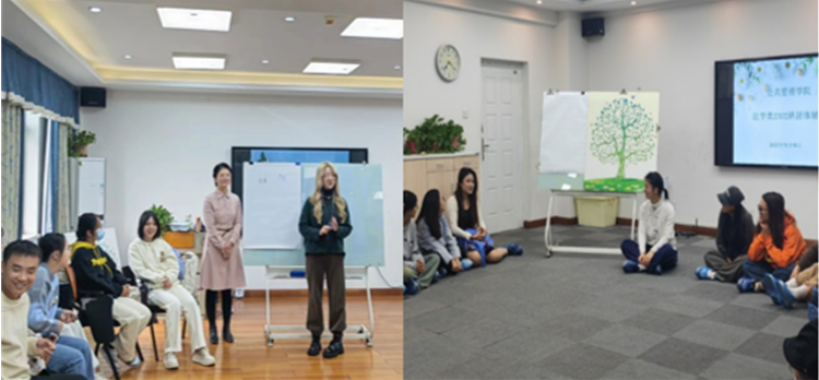 在破冰阶段,梁老师先带领新生进行了“手指操”“松鼠大树地震”和分享名字的故事等热身活动,使同学放松心情,安心地处在团辅氛围中,以放松自在的心态进行交流。同学的积极性被调动起来,整体氛围十分融洽。