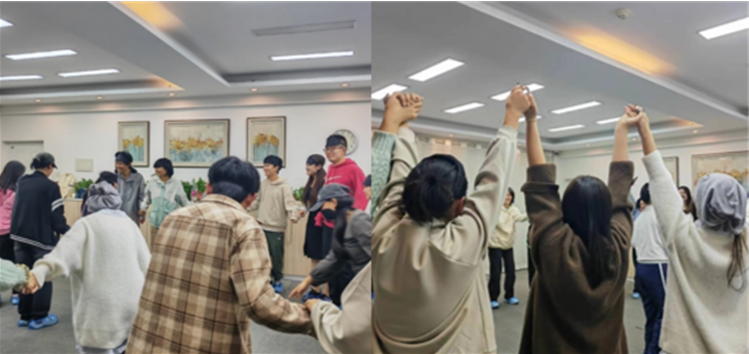 随后,同学们又戴上眼罩,体验了“解开千千结”的游戏,各个同学都为解结而努力,为解开而欢呼。同学间形成了指挥、调度、行动的分工,现场充满欢声笑语,活动氛围达到顶峰。