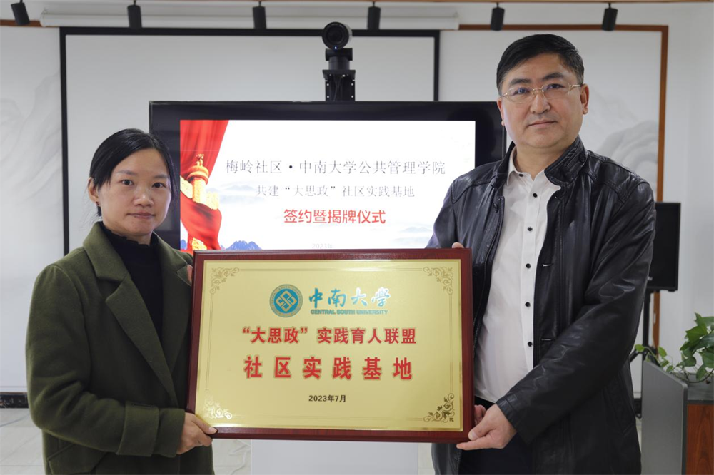 11月23日上午10时30分,公共管理学院与梅岭社区共建的“大思政”社区实践基地签约暨揭牌仪式在市天心区文源街道梅岭社区举行,公管院党委副书记耿贵斌、院分团委书记梁慧,文源街道梅岭社区党建专职副书记陈婷女士、居委会副主任蒋志娟女士出席活动。