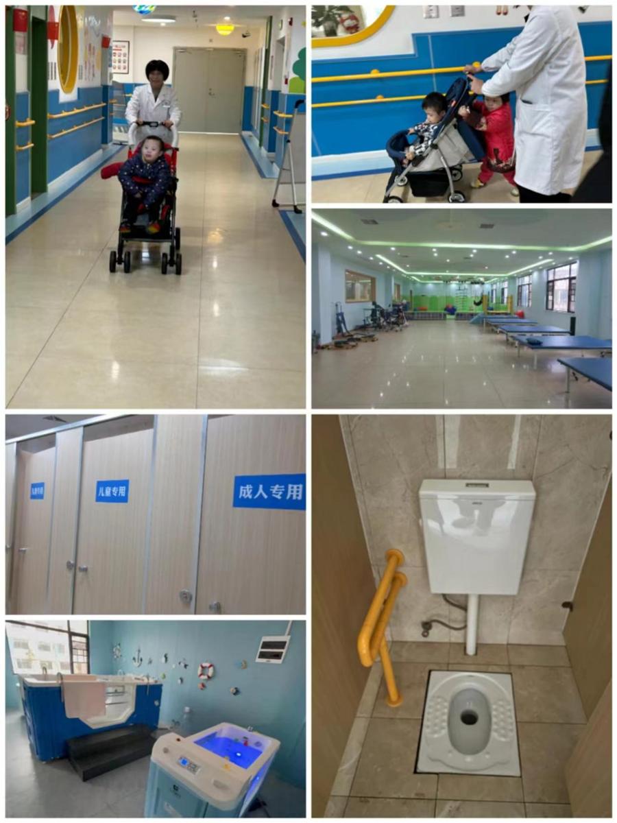之后,调研小组进入了儿童福利院的康复中心,其中分布有各式各样的医疗器材,为院内孩子提供全面科学的医疗保障。由于近期儿童流感频发,为保证孩子们的安全健康,调研小组没有同孩子们直接交流接触。但在前往康复中心途中,队员们仍看见了孩子们与养护人员灿烂的笑容。在调研过程中,小组成员还发现卫生间进行了成人专用与儿童专用的分区,儿童专用的坑位尺寸更适合儿童如厕,同时还贴心地设置了高度适中的防滑扶手,体现了福利院对儿童无微不至的关怀。