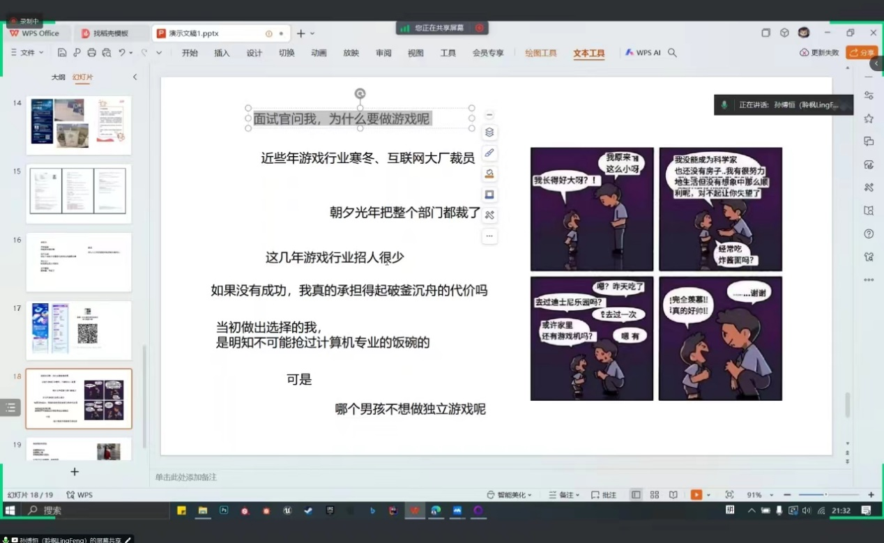 孙博恒同学以“不负热爱”为主题,向大家介绍了自己以兴趣和梦想职业为目标的求职经历,鼓励同学们追求自己所热爱的职业,并多参与实习,增加自己的实习经验。而南栋同学以自己投递简历的经验为切入点,向同学们分享了写简历的经验和自我介绍的小技巧。他提醒同学们写简历时需要把握受众需求,并且保持简历页面简洁度,有针对性地突出自己的工作能力和工作意愿。最后,张鲲鹏同学分享了自己在求职准备阶段和参与阶段的经历,向同学们分享了多方面收集招聘信息的渠道,鼓励大家坚持学习,找到心仪的意向工作后应及时投递简历,主动参加就业宣讲会,积极把握求职机会。