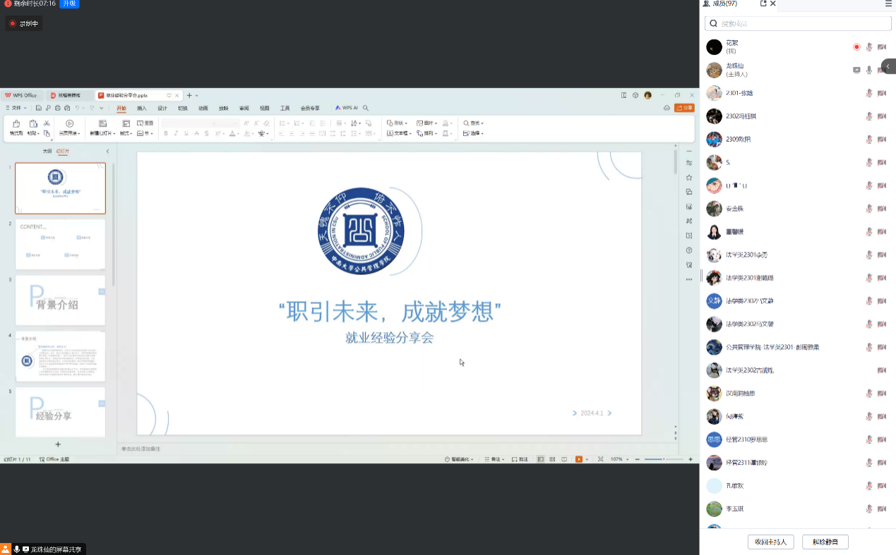为帮助学院学子更好了解就业形势,明晰未来发展方向,做好求职准备,4月1日晚上9时,公共管理学院举办“‘职’引未来,成就梦想”线上求职经验分享会活动,公管院2020级优秀本科毕业学子社会学2002班孙博恒同学、社会学2002班南栋同学、行管2002班张鲲鹏同学作为分享嘉宾线上向同学们分享自己的求职经验,为同学们提供一些实用的指导和建议。