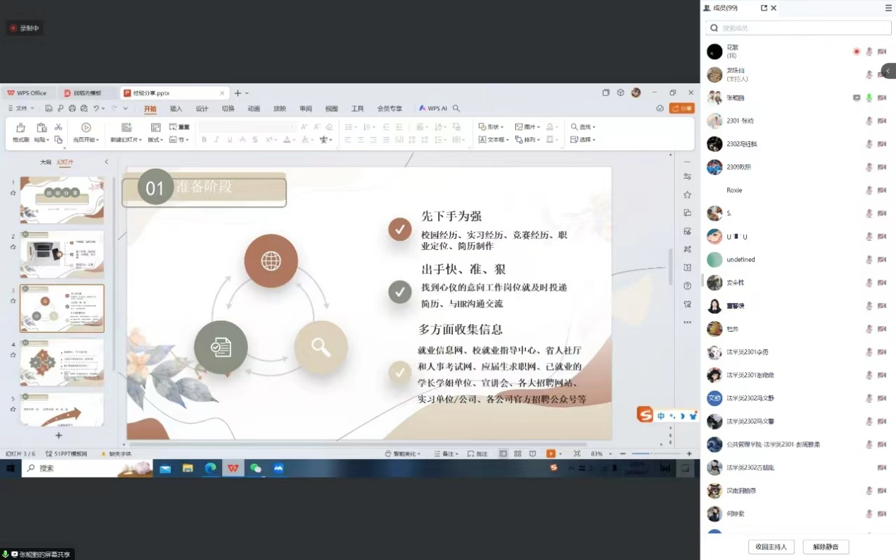 分享会开始,首先由主持人张笑曼同学向同学们介绍了此次活动的流程以及分享嘉宾。接着由三位分享嘉宾先后向大家进行求职经验分享。