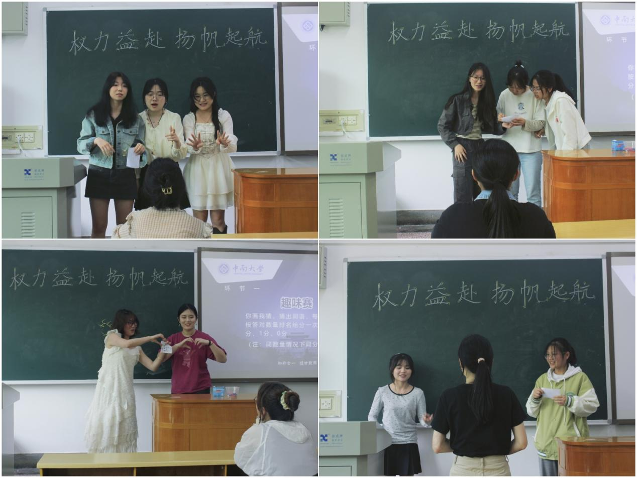 此次竞赛分为单人赛与团体赛,其中的团体赛包括基础赛、加分赛与趣味赛三个环节,共有12支队伍参与其中。在基础赛中,各队伍成员凭借扎实的知识基础和精湛的答题技巧,为团队争取到了宝贵的分数。在之后的加分赛中,轮答和抢答环节将比赛的紧张气氛推向高潮。同学们思维敏捷,反应迅速,展现出了出色的团队协作和应变能力。在趣味赛中,“你画我猜”游戏进一步点燃了现场气氛。同学们通过画图和猜词的方式,展现出无限的创意和想象力。同学们在游戏中展现出了丰富的知识储备,团队成员之间的默契和沟通也为他们赢得了分值。最后,各队伍在抢答赛中更是摩拳擦掌、蓄势待发。主持人发问完毕后,队员们迅速反应,准确无误地给出答案,充分展示了他们在权益知识方面的深厚基础和出色的反应能力。