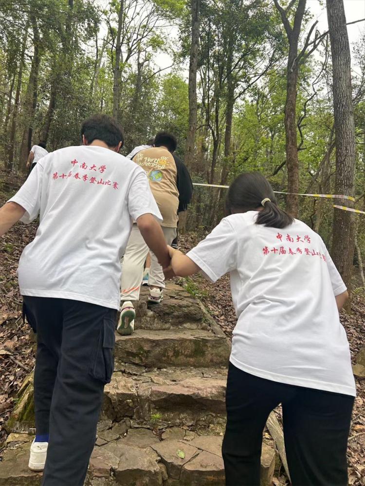 随着裁判员一声令下,公管院登山小队在校本部和平楼前正式出发。他们沿升华大道一路跑步前行,途径民主楼、荷花池、学生三五食堂,随后沿山路攀登而上。在登上岳麓山、前往丁文江墓打卡点时,李旋同学突发身体不适,伊尔番同学、王海天同学察觉后主动伸出援手,搀扶李旋同学继续向终点前行。在大家的共同努力下,公共管理学院登山小队以21分48秒的总成绩获得团体第十二名,同学们在终点合影留念。
