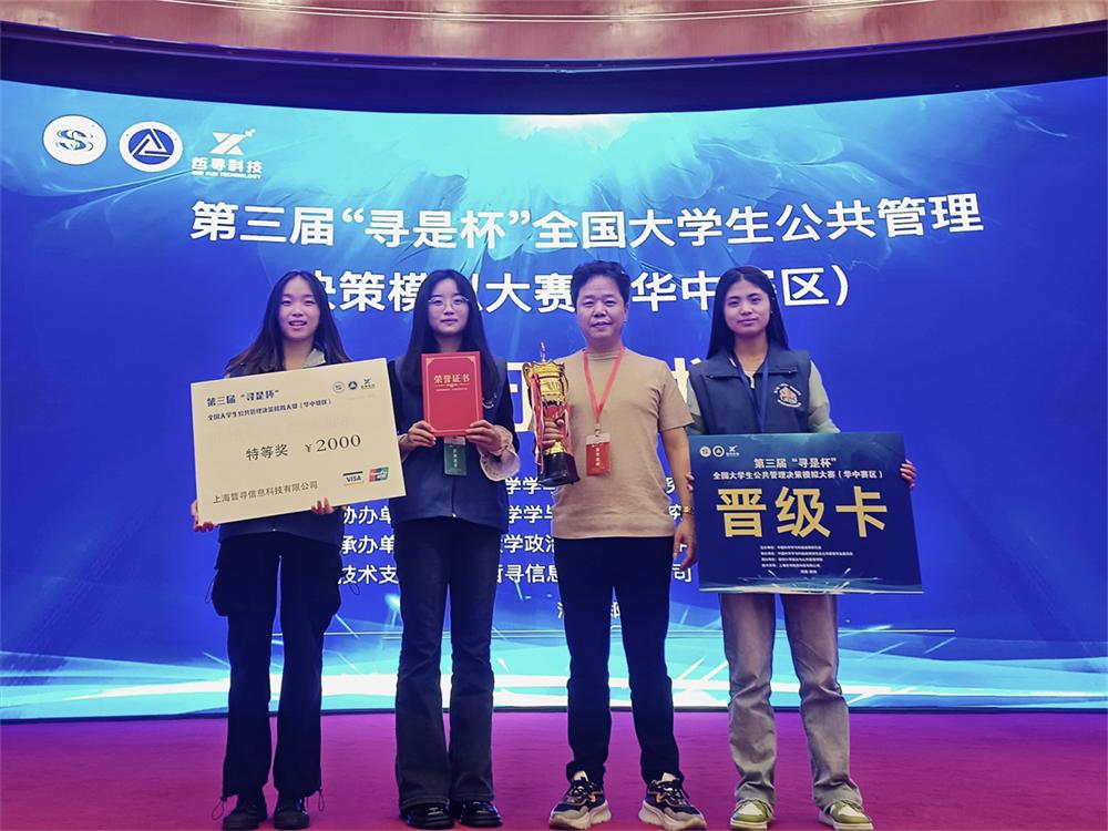 2024年4月19日至21日,第三届“寻是杯”华中赛区全国大学生公共管理决策模拟大赛在河南郑州举行。在公管院公管系副教授欧阳万福、刘媛两位老师的指导下,来自2021级行政管理专业的杨晓婷、张楠、于玉莲三位本科学子代表我校公共管理学院参赛,并从华中赛区来自58所高校的59支队伍中脱颖而出,荣获特等奖的优异成绩。